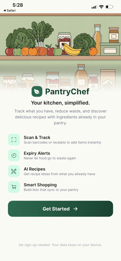A few hours later, with me coaching, we built PantryChef — a fully functional iPhone app with barcode scanning to add pantry items, expiry date alerts so nothing goes to waste, AI-powered recipe suggestions based on what’s actually in your kitchen, and smart shopping lists that sync to your pantry inventory. It has a polished landing page. It has a clean UI with illustrated pantry shelves and a “Get Started” button. It looks like something a design team might have spent weeks on a few years ago.